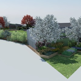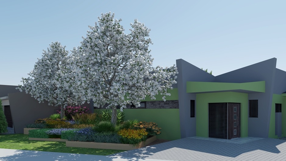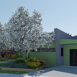 Riešenie: Po dlhých úvahách som použil pôdorys domu ako šablónu pri opakovaní. Dom je vlastne obtisk trávnatej plochy a zvyšok sú trvalky. Použité drevené palisády som rozmiestnil v rôznych výškových úrovniach a hrúbkach materiáloch. Ústrednou myšlienkou v pohľadovej zóne sú siete vyplietané z oceľových lán ukotvených v drevených „L“ profiloch. Altánok opakuje geometrický tvar steny z domu a otvára sa do priestoru presklenenými stenami a v jednej strane posuvnými dverami. Predný vstup do domu bol tiež mierne komplikovaný, ale dostal som tam pohyb v zmene výšky záhonov čím je vstup reprezentatívnou ukážkou pre návštevníkov domu. Otázka: Čo asi bude v ďalších častiach záhrady?
